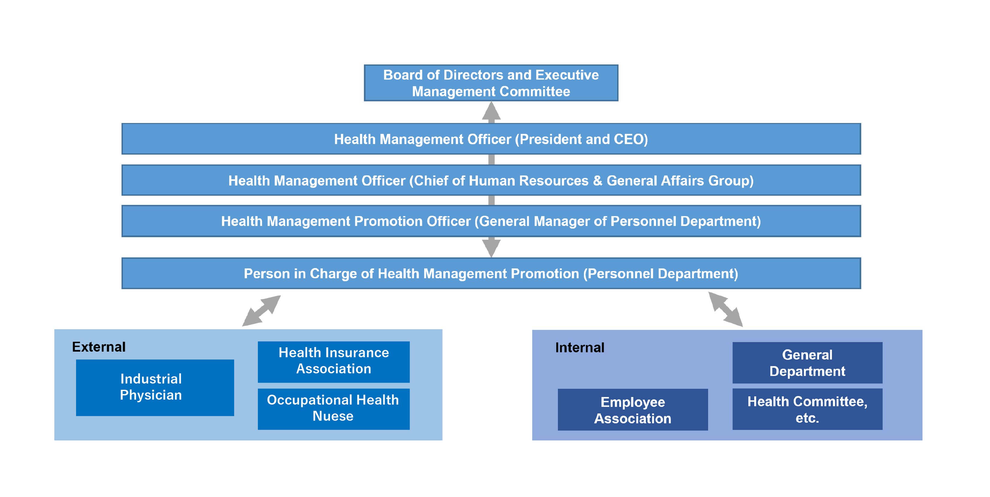 Under the responsibility of the President and CEO, who serves as the Chief Health Management Officer, the Personnel Department takes the lead in promoting health management in collaboration with the Health Insurance Association, our industrial physician, occupational health nurses, internal stakeholders, and the Employee Association (employee representatives), among others.
