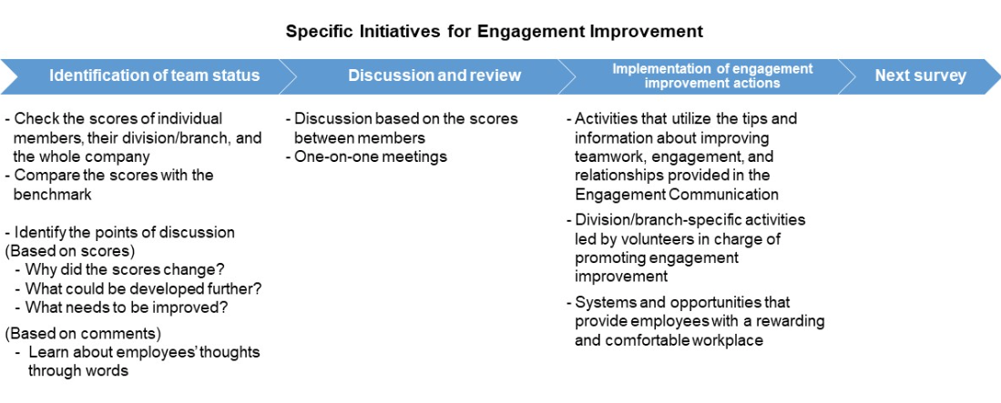 In order to capture employee awareness in a timely manner and create a better working environment, we have conducted an engagement survey every three months since August 2021. We thus aim to realize a better working environment by implementing measures to enhance employee engagement via encouraging them to take ownership of engagement.