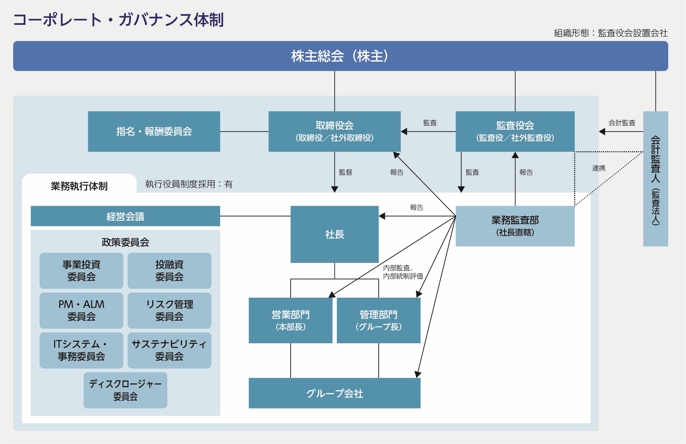 また、政策委員会として、事業投資委員会、投融資委員会、PM・ALM委員会、リスク管理委員会、ITシステム・事務委員会、サステナビリティ委員会、ディスクロージャー委員会を設置し、機能別に十分な議論・検討を行う体制としております。